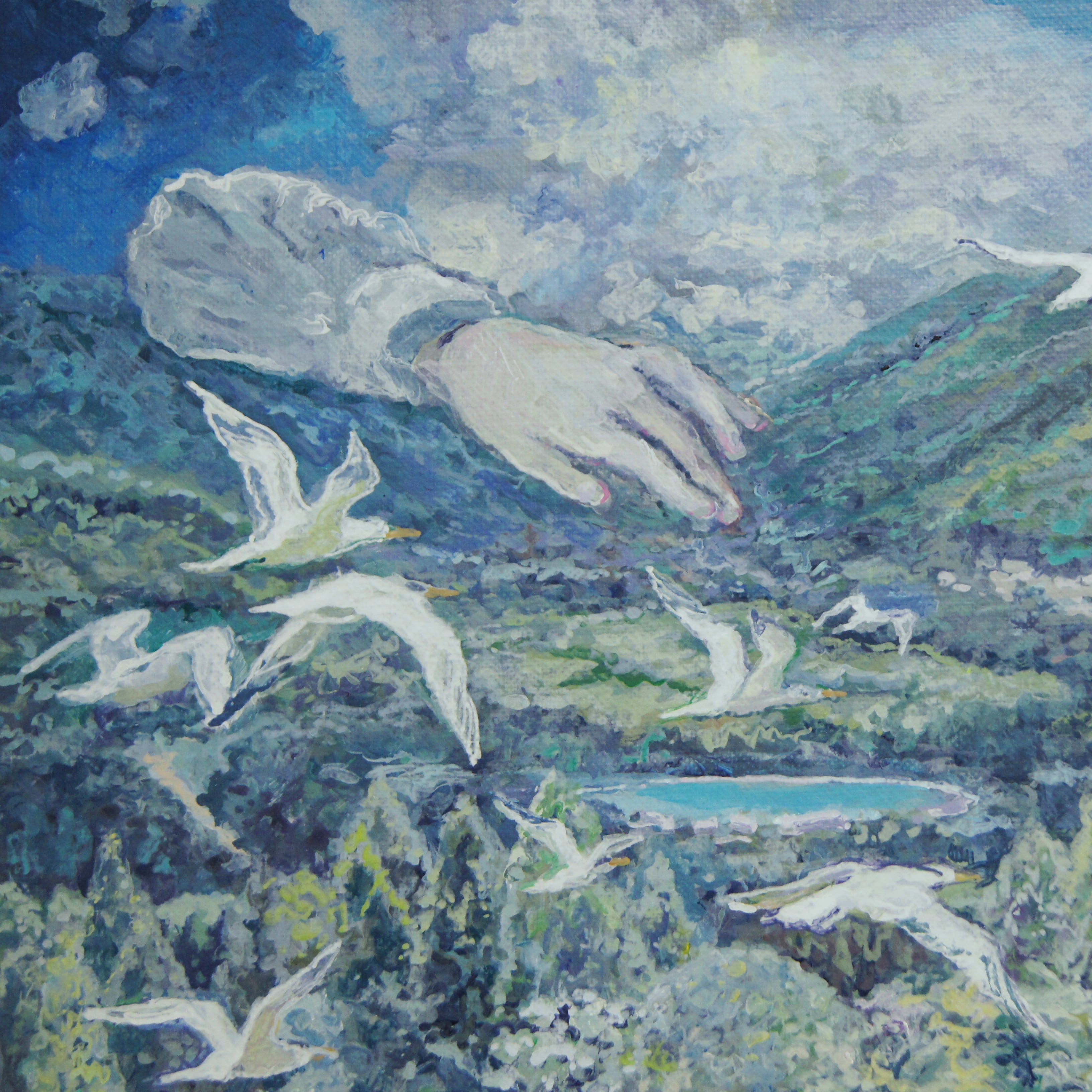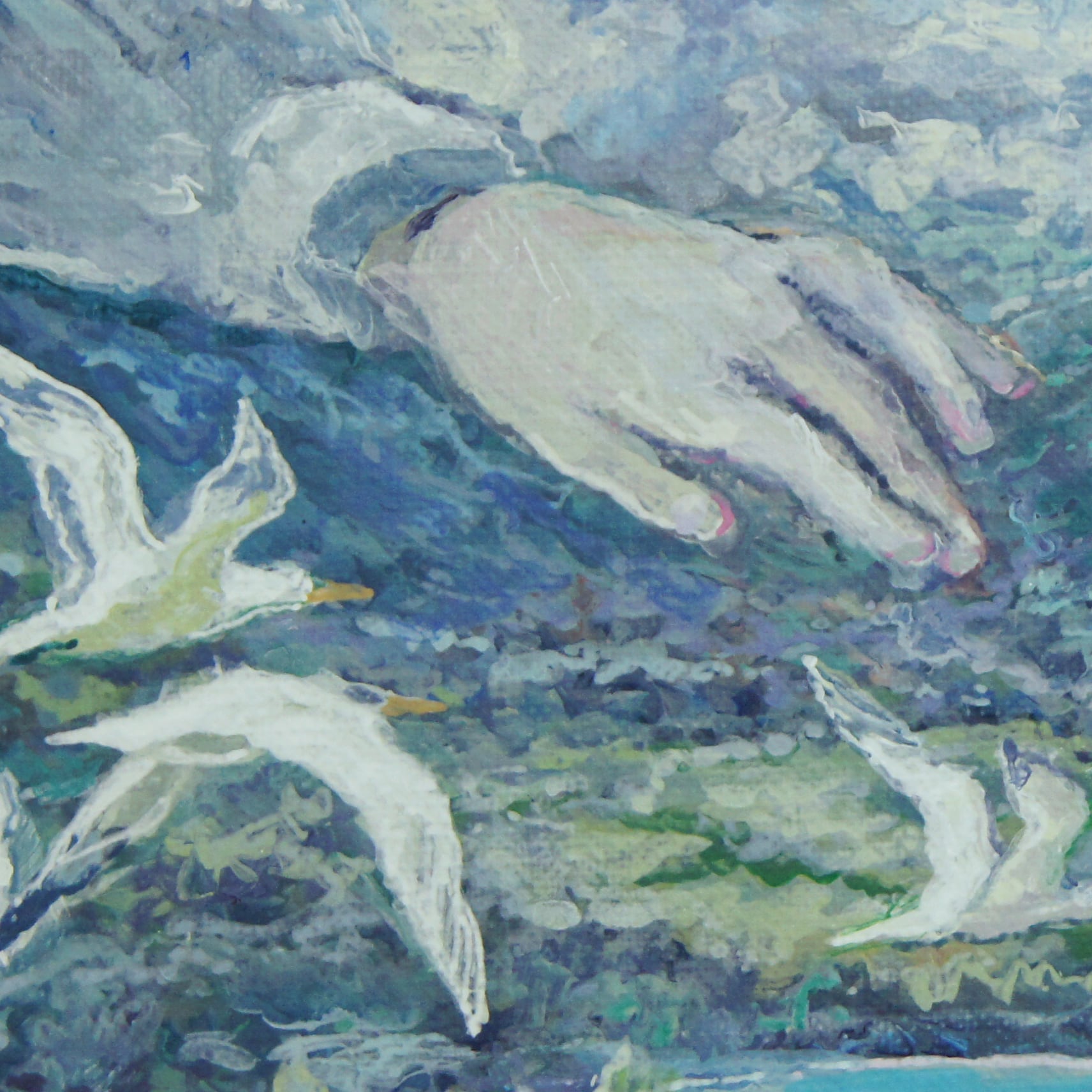 はじめに、向かって右側の木と家を描き、そこを出発点としてまわりの要素を構成していきました。それぞれのモチーフの領域を緩やかにつないでいくように、かもめを描きました。手は何度も描きなおすうちに、次第と今の形と場所に、とどまりました。