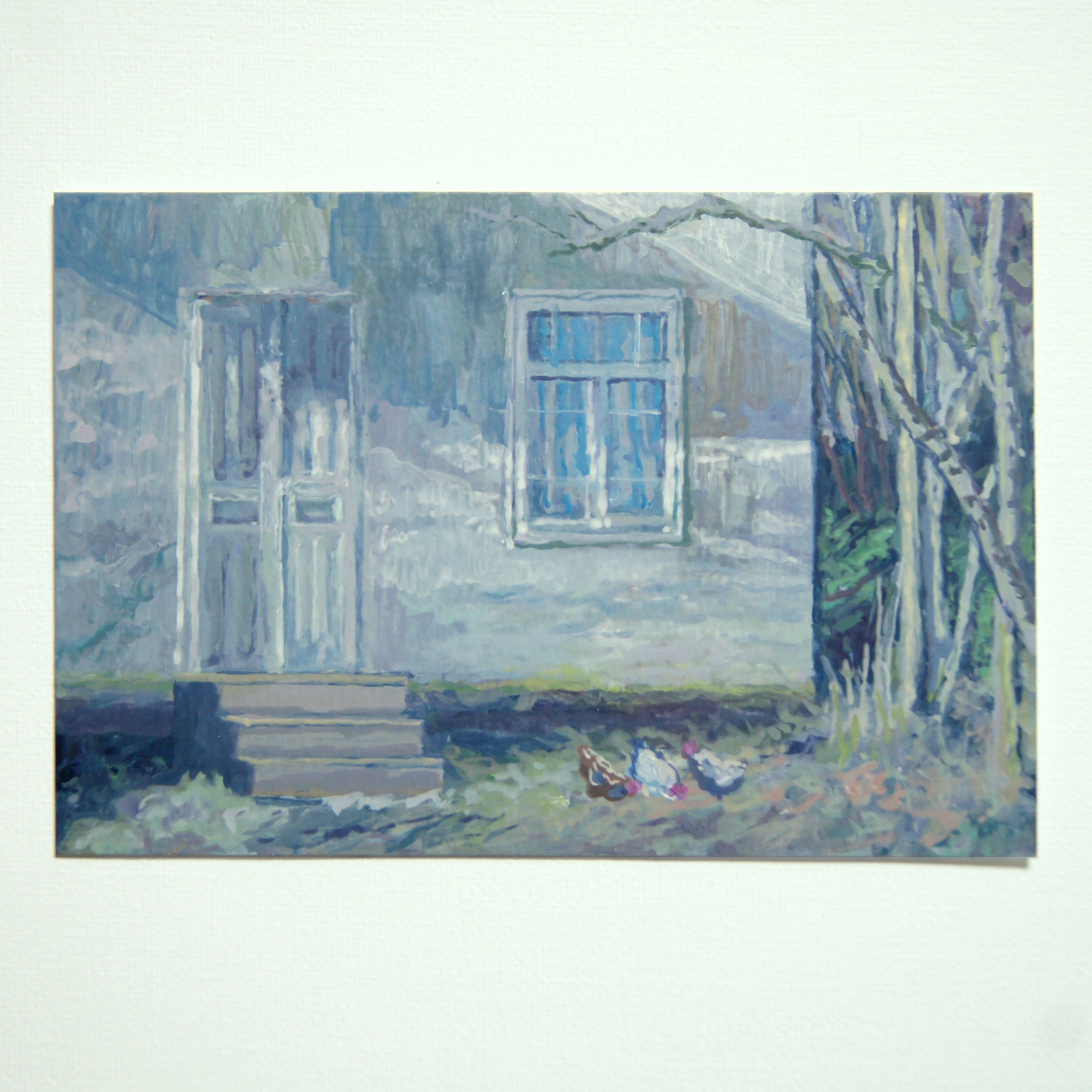 いつの日にか見た、朝もやのなか、草むらに放されたにわとりたち。