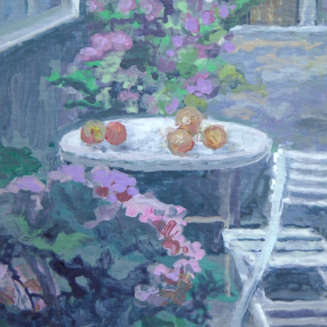 テーブルに置かれた果物は、最初はりんごを思い浮かべていましたが、オレンジにも黄桃にも見え、絵のうえで物の存在が揺らいでいるようすに、愛着を持って描きました。