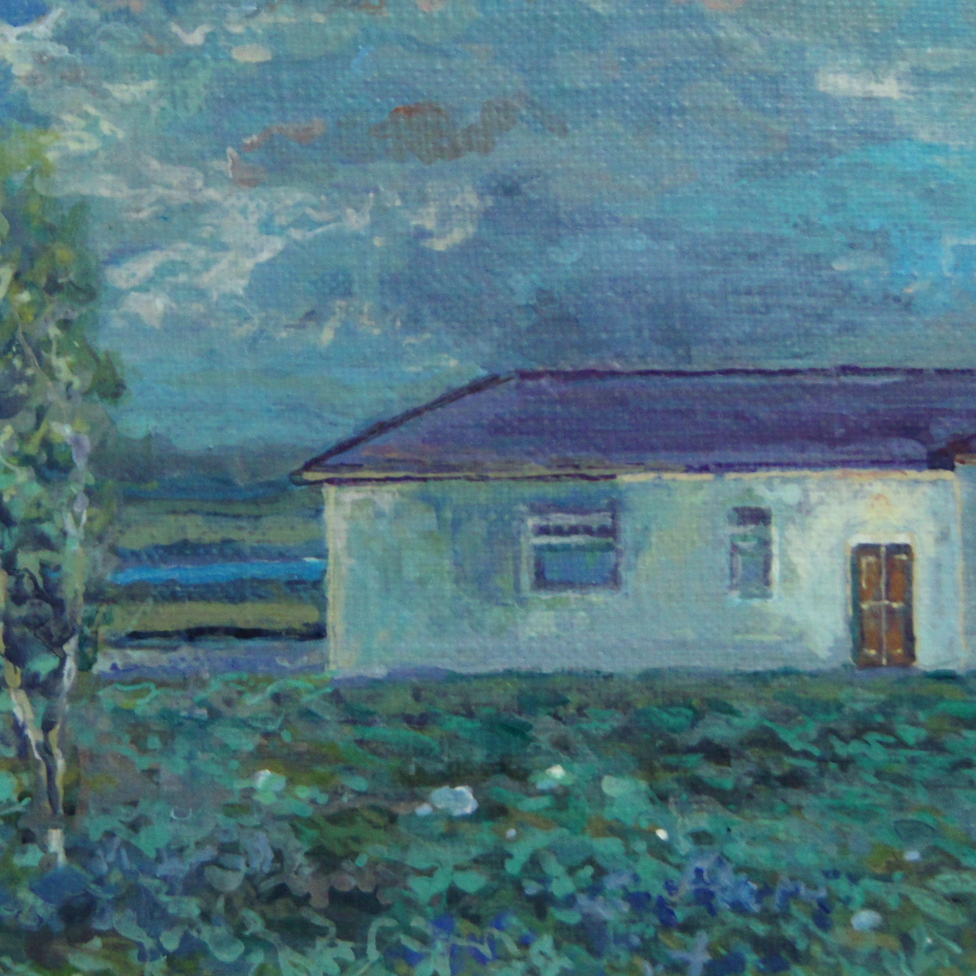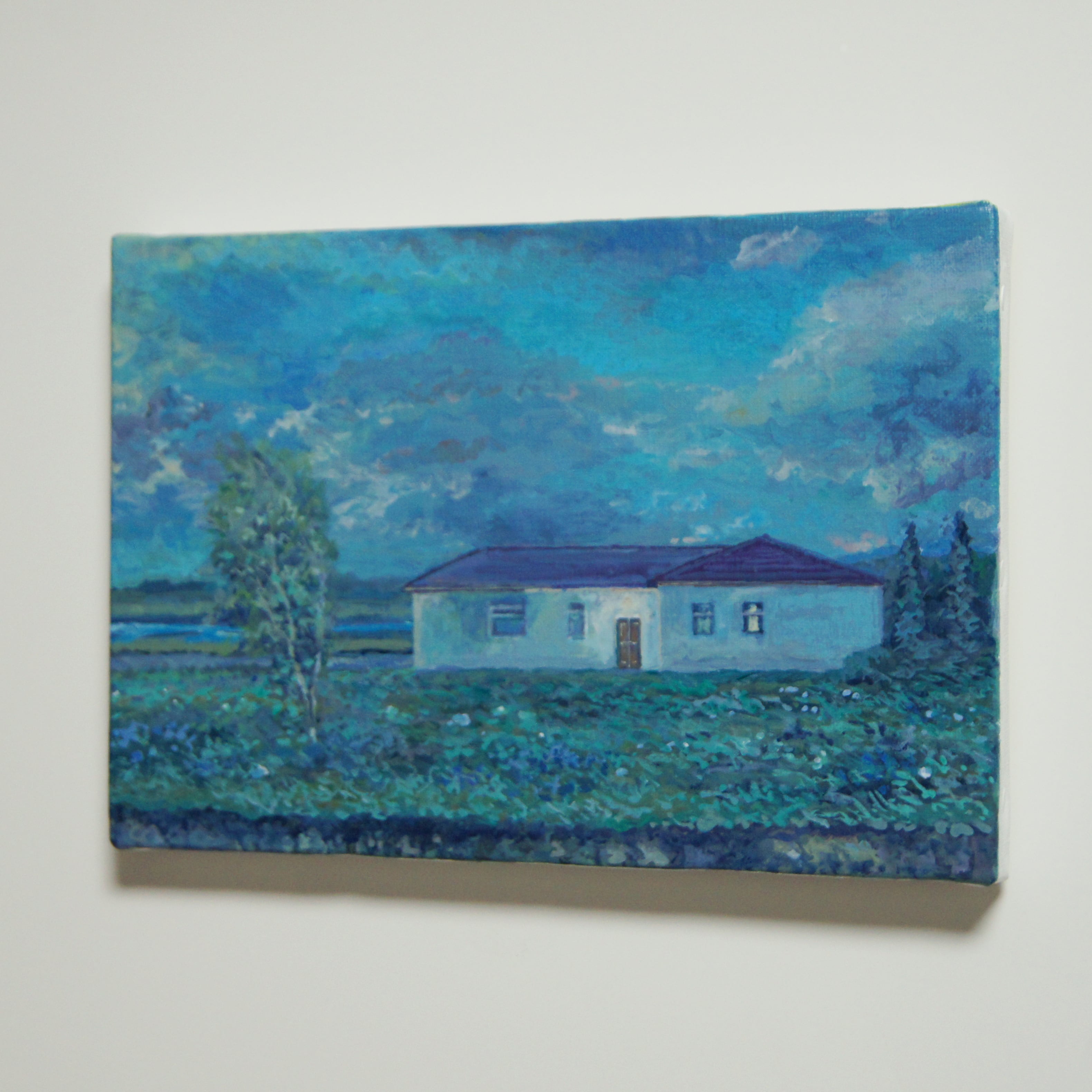 朝方か夕暮れの時間の、家のあかりがともる風景を描きました。外は風が吹いていて、季節の変わり目を告げています。