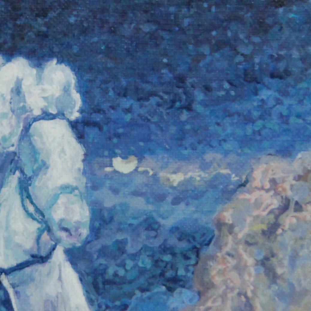 この人物と馬たちはつながりがあるように感じましたので、画面の中で組み合わせてひとつになるように描きました。服の線と手綱がリズムをつけてつながるように描き、夜の空を重ねました。