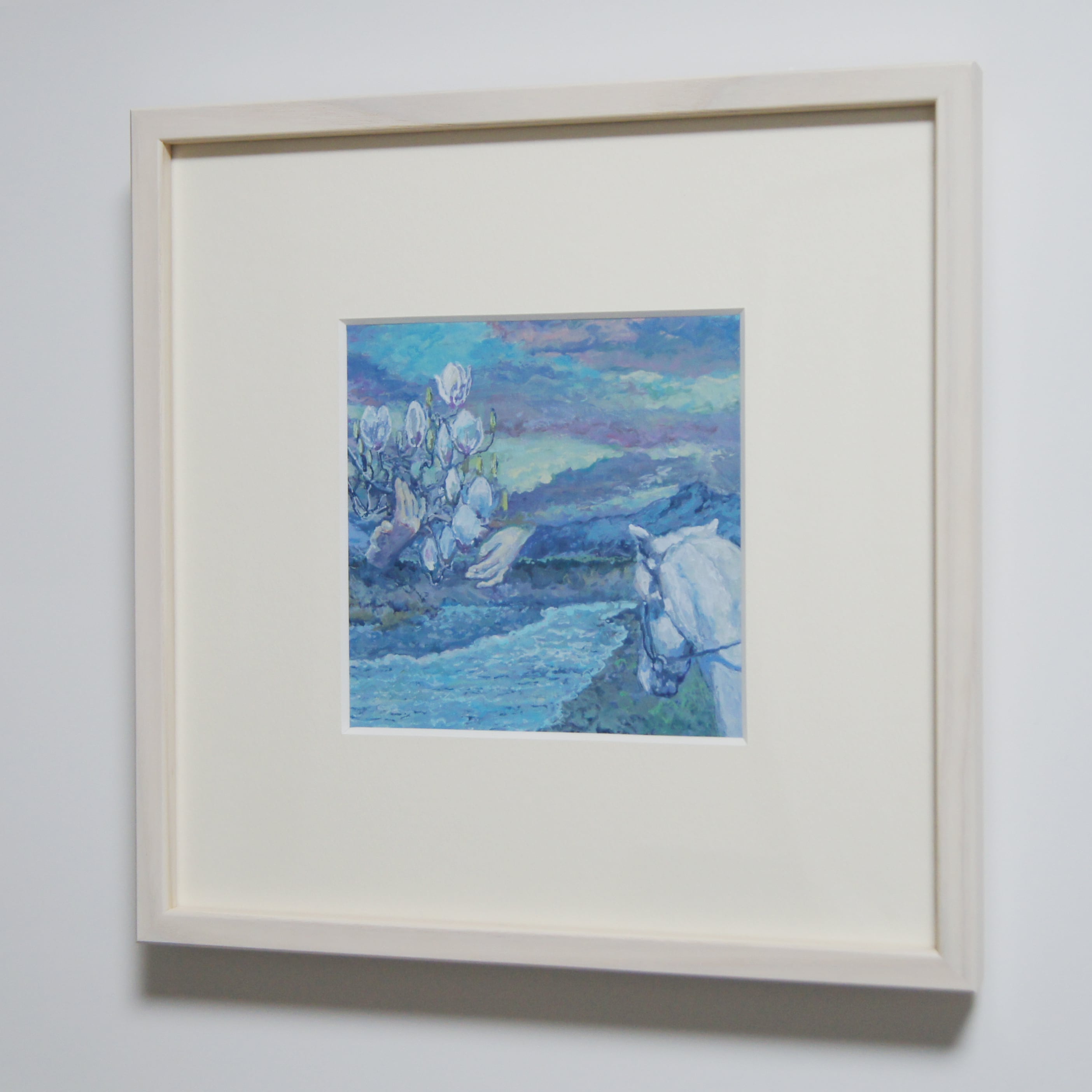 木蓮の花が燭台のように感じましたので、手で炎を包むように構成し、それを見つめる馬を描きました。馬の題材は、以前岡山県湯郷にある温泉宿で、レ-シングドライバーのセナ氏が1994年に宿泊された客室に作品を展示する機会があり、その時に馬を描いたことがきっかけで、今も描いています。