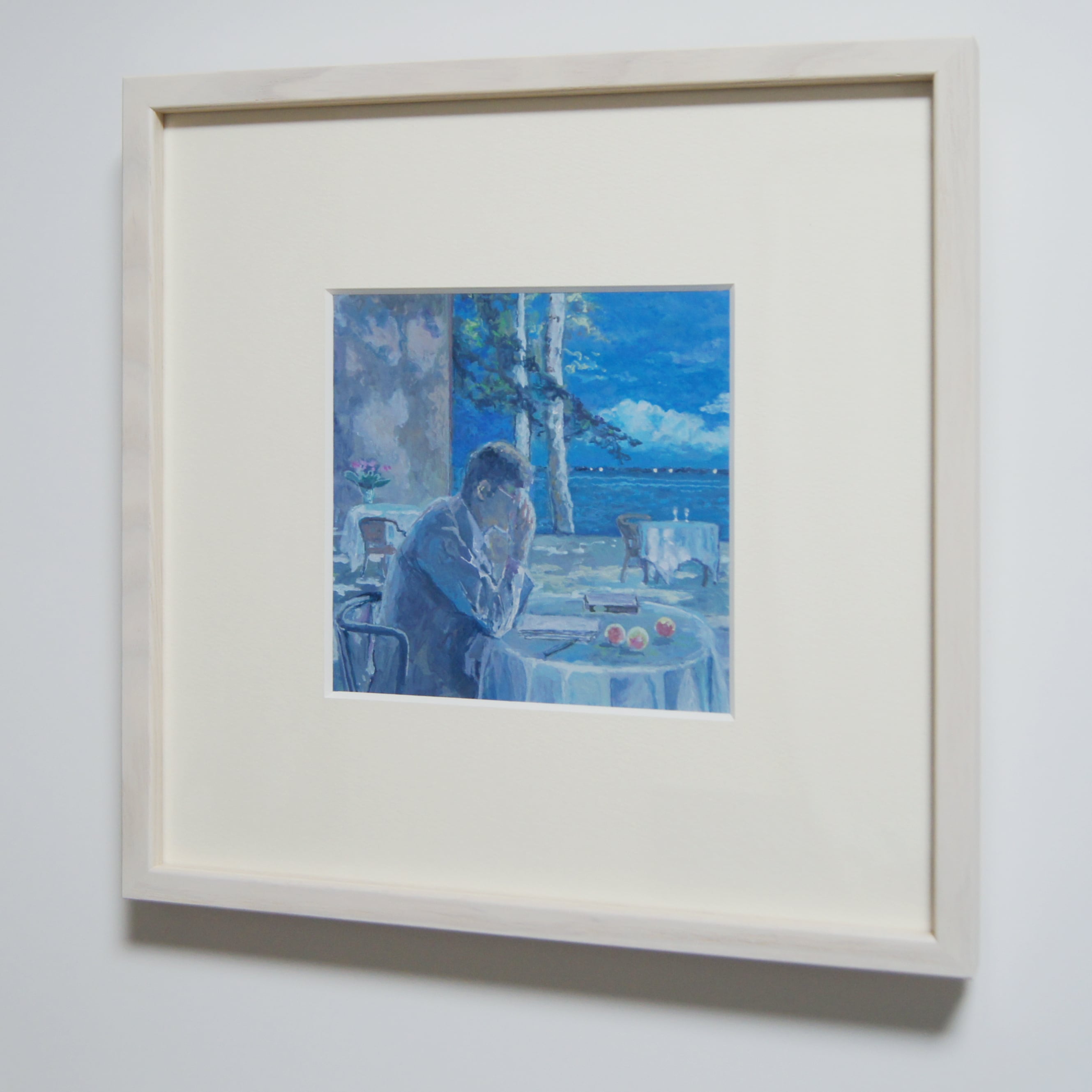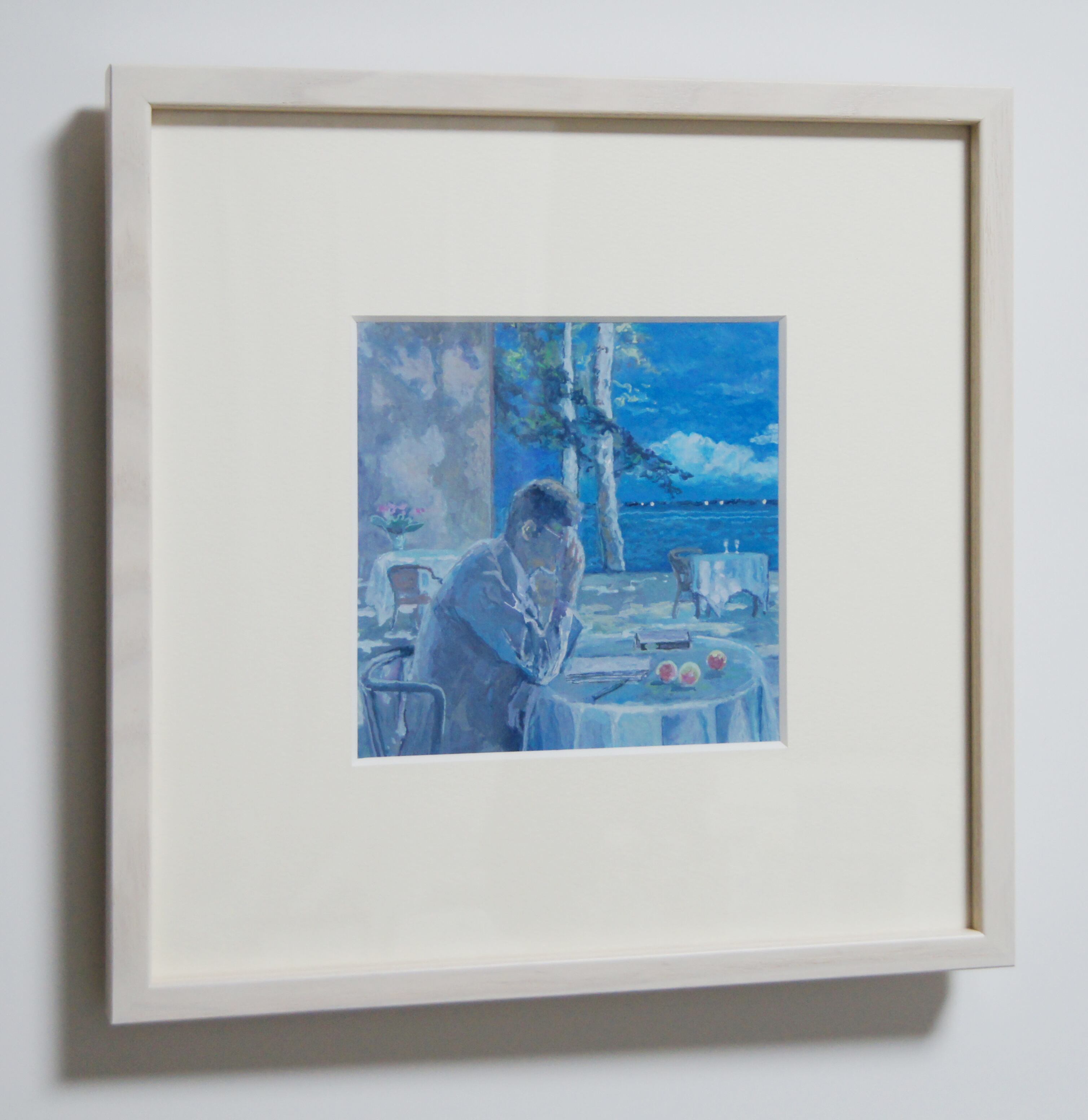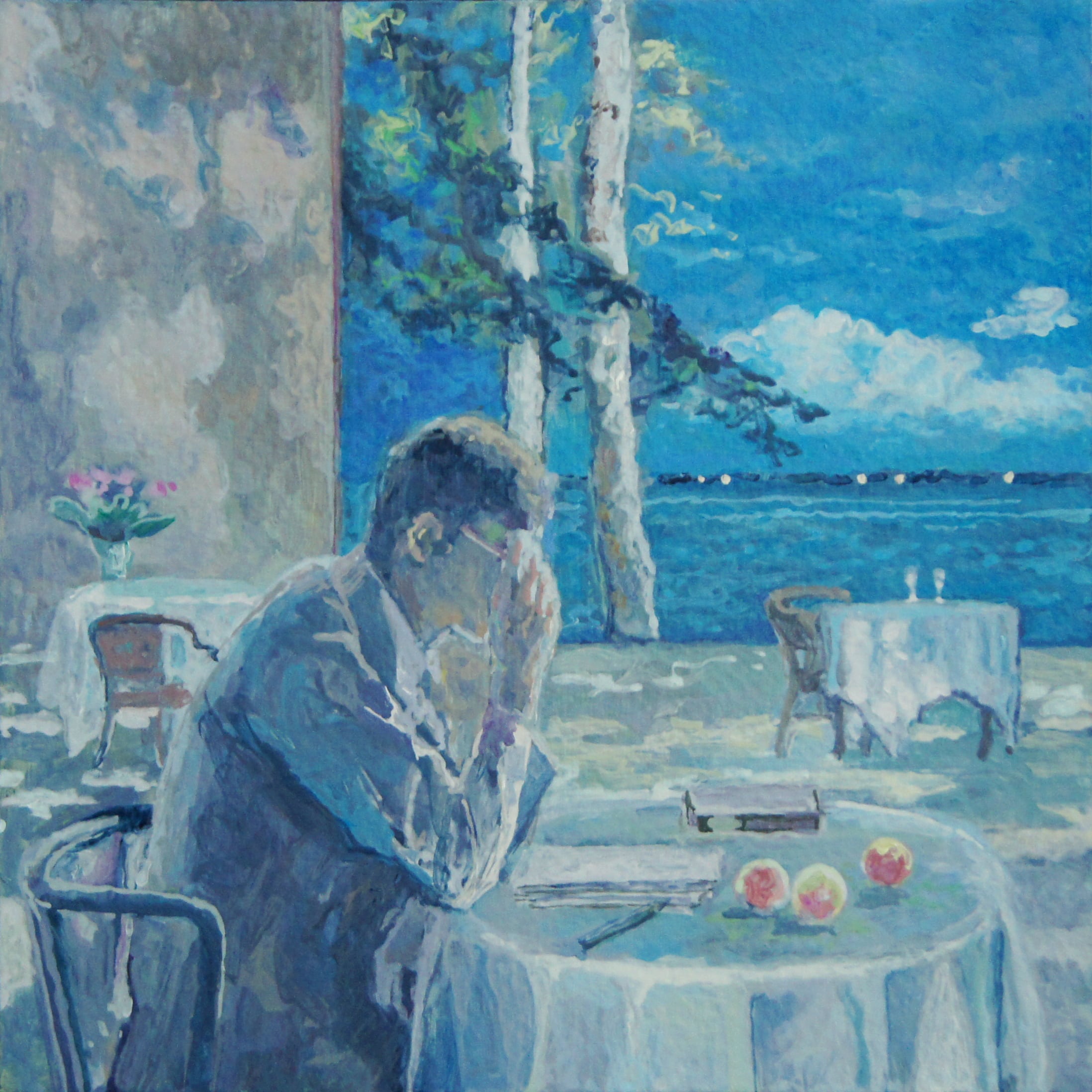 だれも知らない場所で原稿に向かう人物を描きました。遠くからかすかにきこえる音をたどりながら、書いているのだとおもいます。